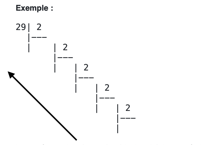 La représentation du nombre binaire s’obtient en écrivant les restes dans le sens de la flèche ci dessus.